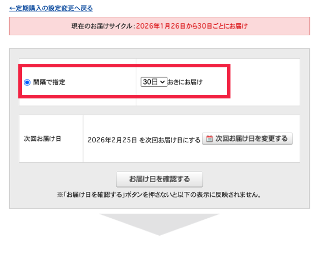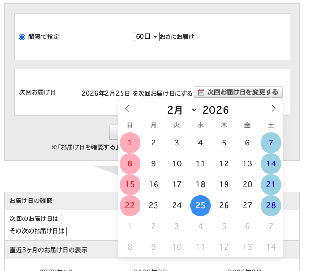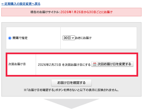次回のお届け日を変更すると、それ以降も新しい日付を基準に定期的にお届けします。