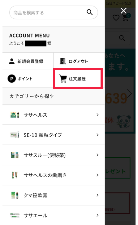 メニューから「注文履歴」をクリックします。