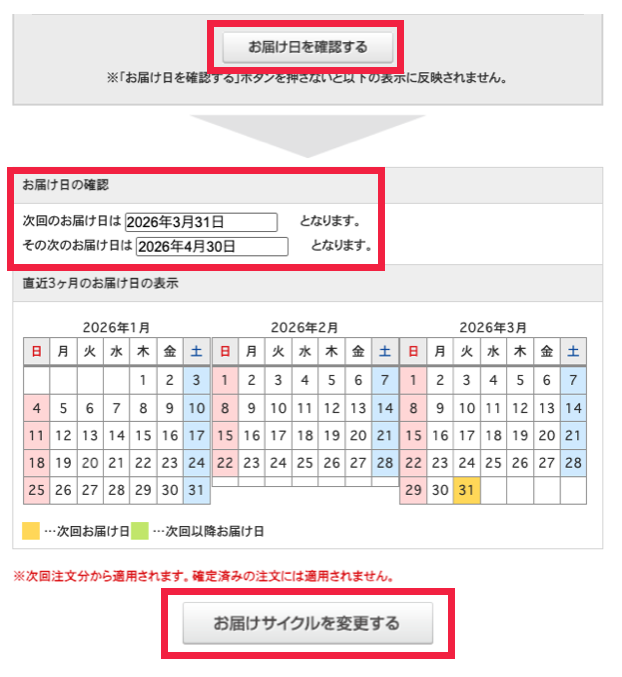 「お届け日を確認する」ボタンを押します。 (変更した日から等間隔でお届けするスケジュールが表示されます)