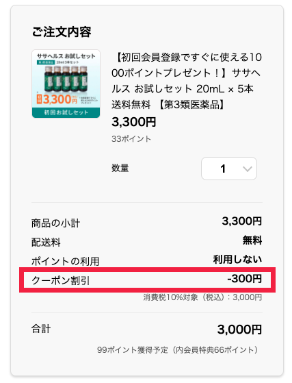 3.注文確認画面でクーポン値引きが適用されているのをご確認ください。