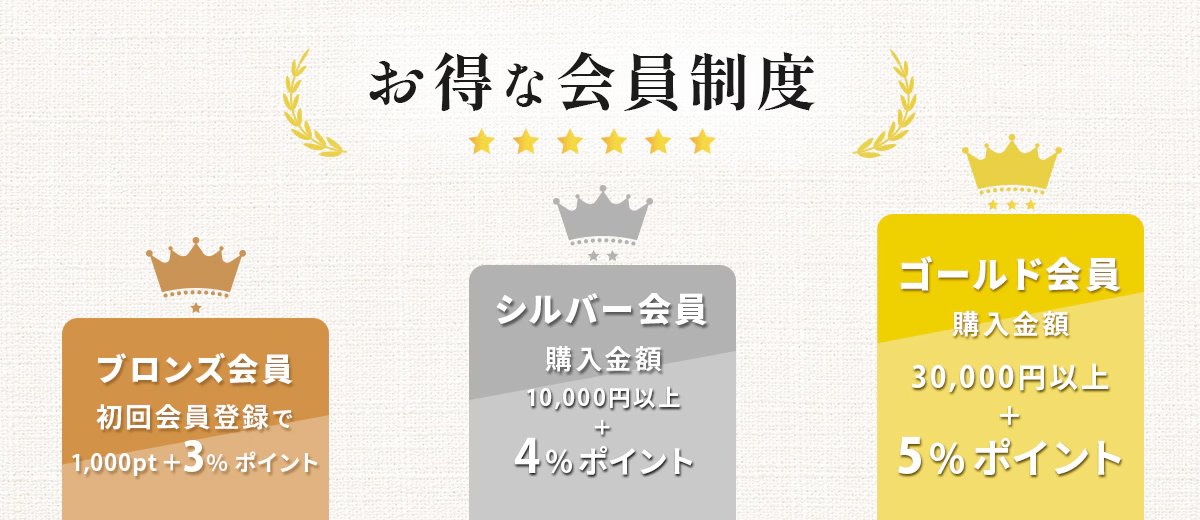 当店では、お買い物の累計金額に応じてポイント還元率がアップする、お得な会員ランク制度を実施しています。